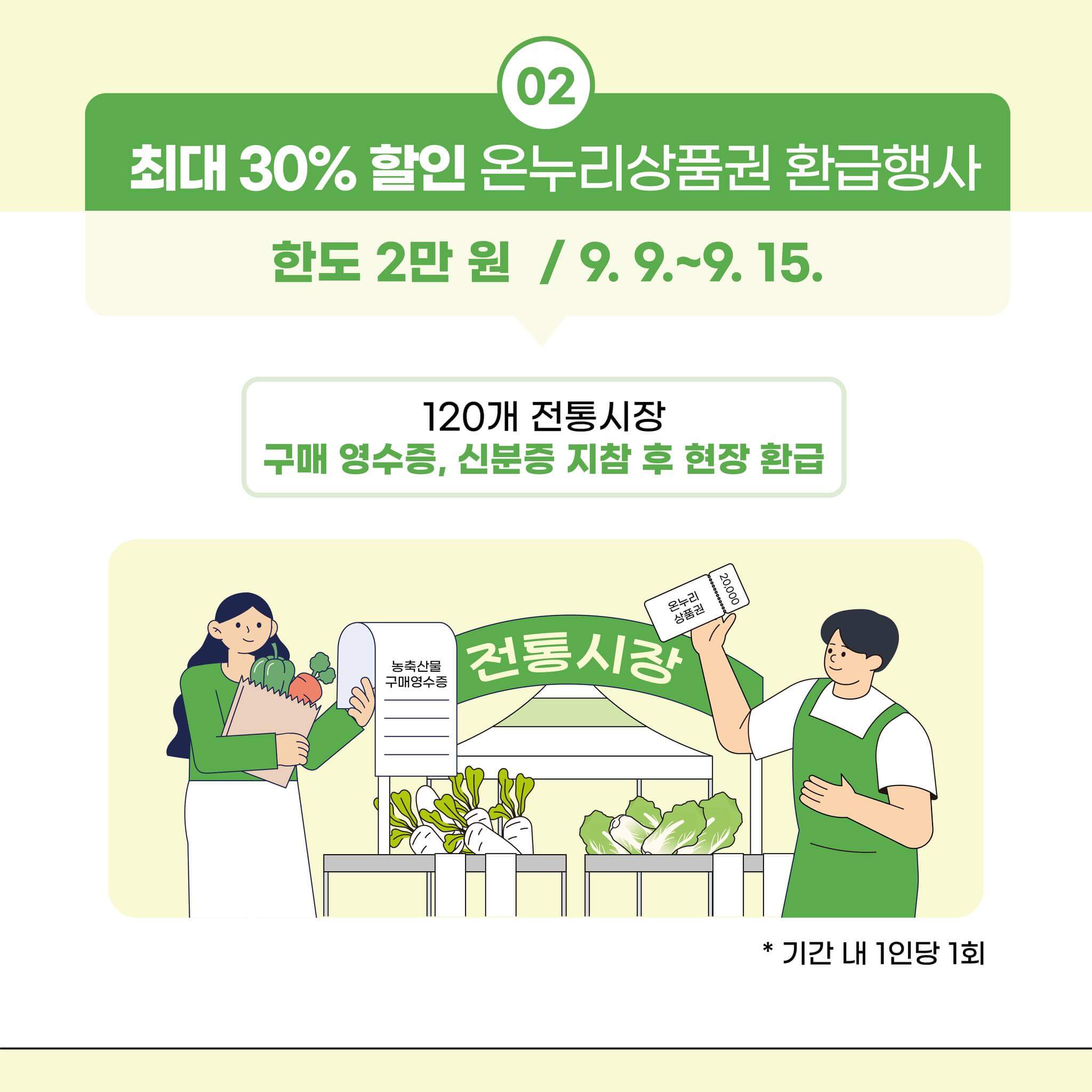 - 장소 : 120개 전통시장(구매 영수증, 신분증 지참 후 현장 환급)
