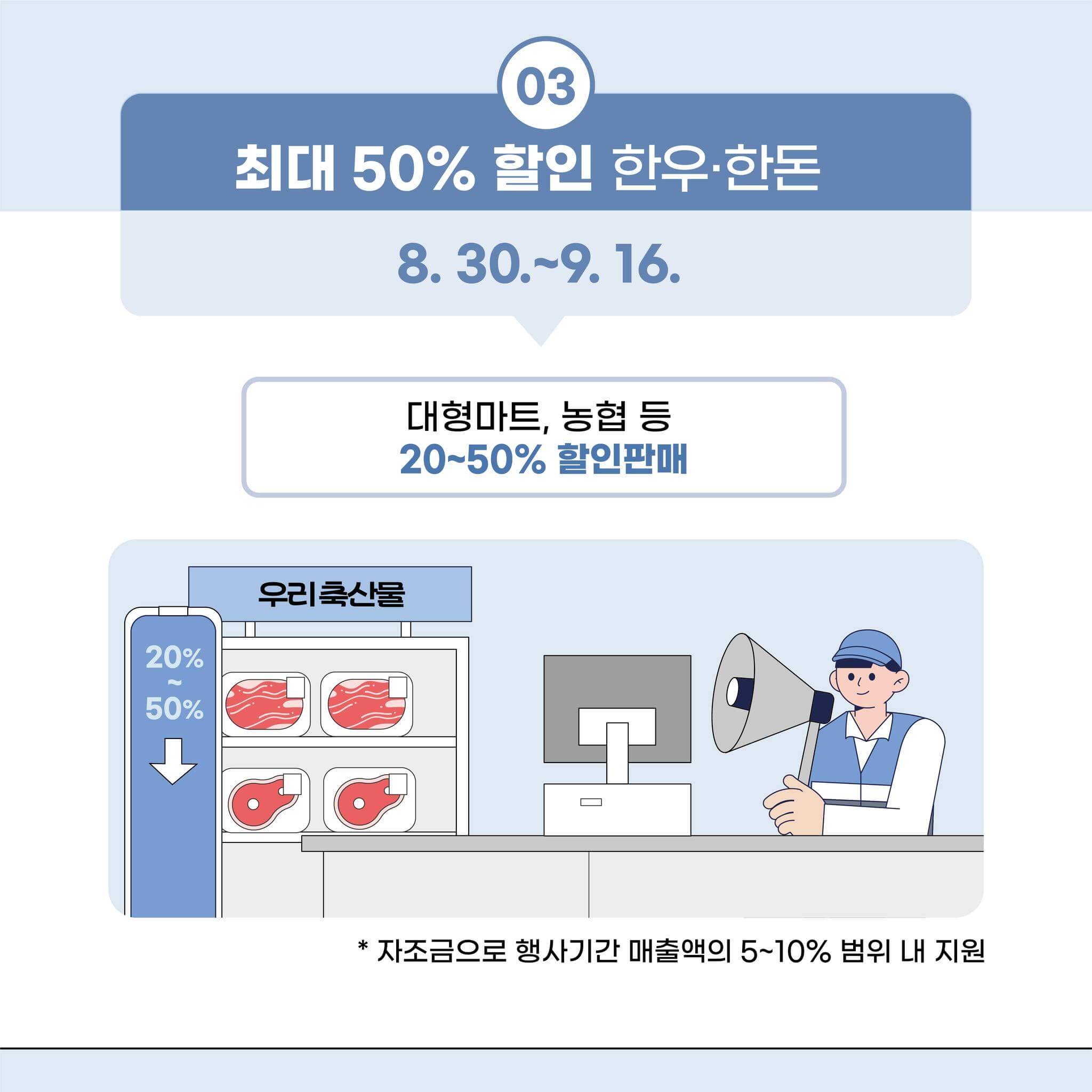 오프라인 마트, 온누리상품권 환급 행사, 한우·한돈 행사가 최대 50% 할인 판매되고 있습니다. 기간이 지정되어 있기 때문에 기간이 지나면 할인 혜택 못받습니다. 농·축산물 할인 지원자세한 정보는 아래 버튼을 누르시면 확인 하실 수 있습니다.