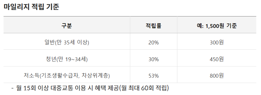 | 최대적립금액 | 대중교통 이용요금 월 20만원까지는 전액 인정, 20만원 초과 시 이용요금의 50%만 적용 예시) 월 60회분에 해당하는 금액이 22만원인 경우, 20만원+(2만원x50%)=21만원에 대한 20~53% 환급률 적용 |
